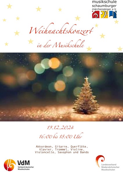 Do, 19.12.24, Weihnachtskonzert in der Musikschule Datum 19 Dez. 2024 Vorbei! Uhrzeit 16:00 - 18:00 Veranstaltungsort Konzertsaal der Musikschule Teile diese Veranstaltung