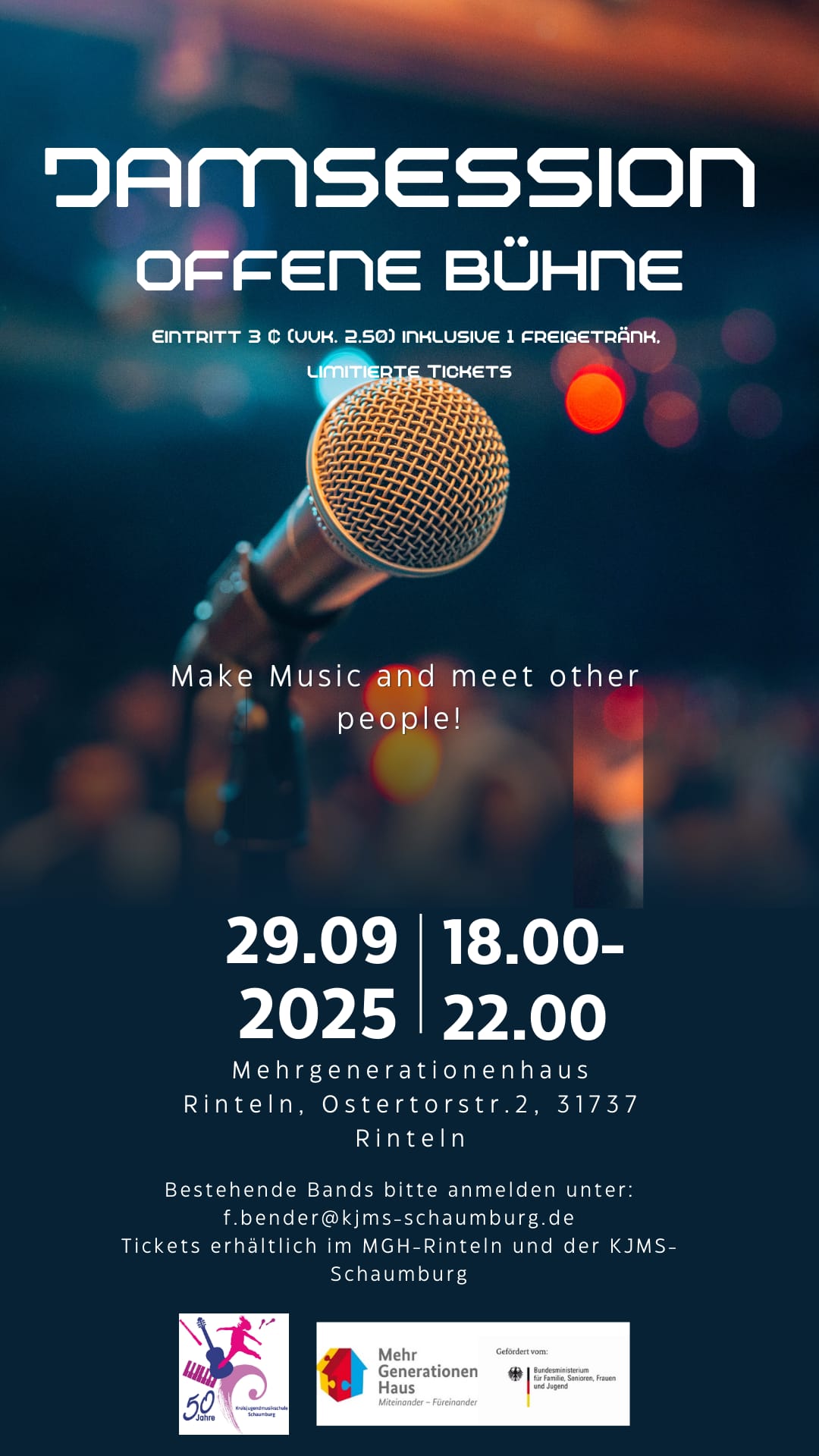 Nach dem großen Erfolg der ersten Offenen Bühne im März diesen Jahres laden die Kreisjugendmusikschule Schaumburg und das Mehrgenerationen-haus Rinteln zur nächsten Jamsession/Offenen Bühne am 29.09.2025 von 18.00 – 22.00 Uhr ein.